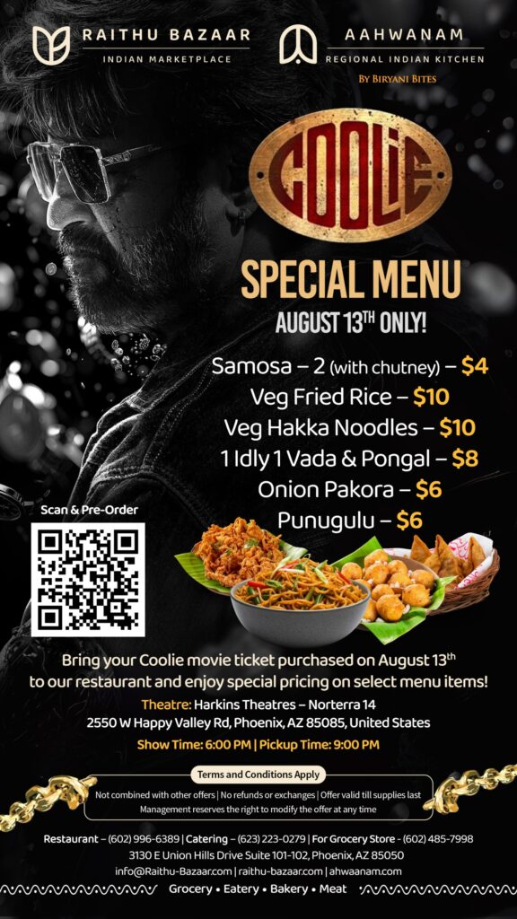 Make your Coolie movie night unforgettableβ bring your ticket and savor Ahwaanamβs special menu, August 13th at 9pm! One day, one celebration.